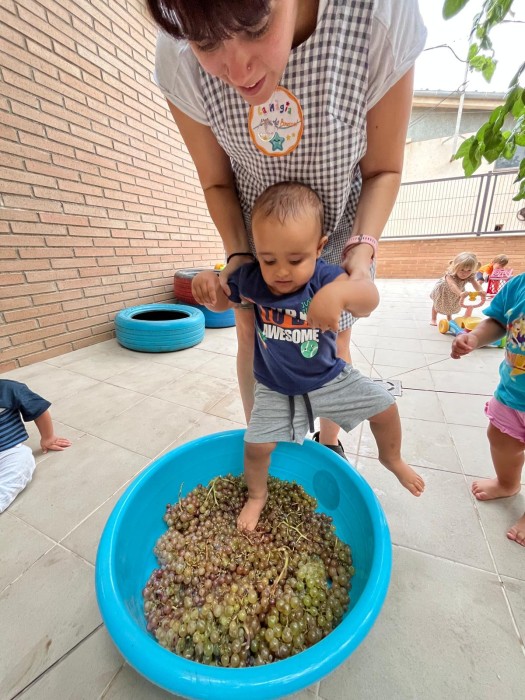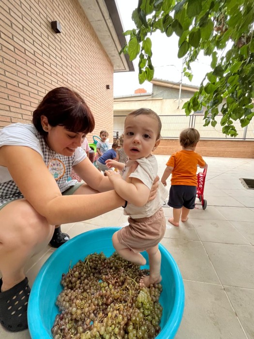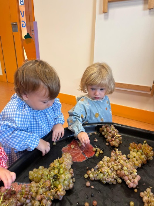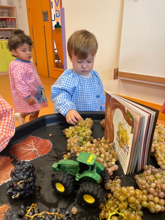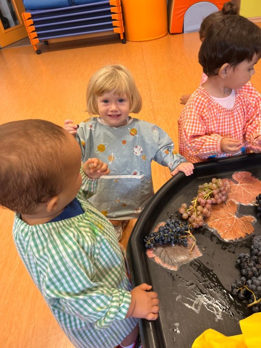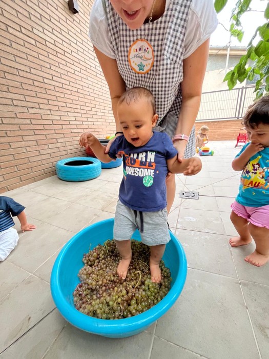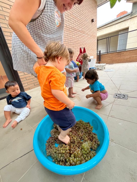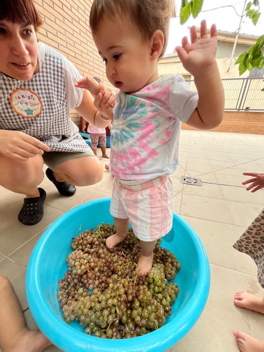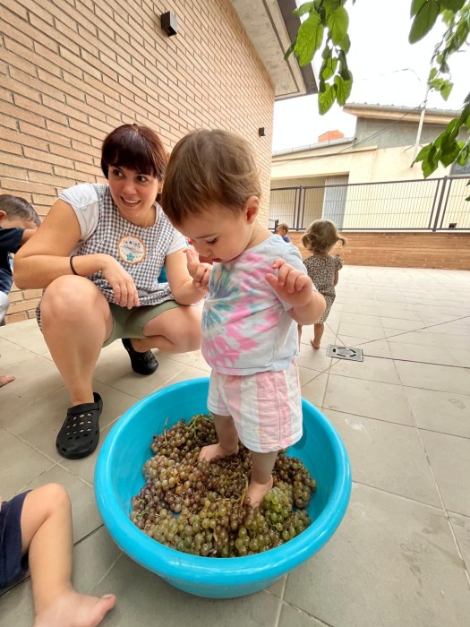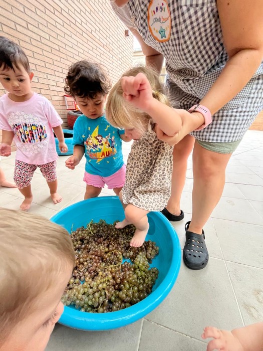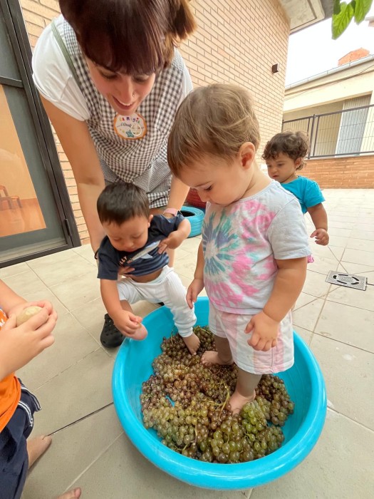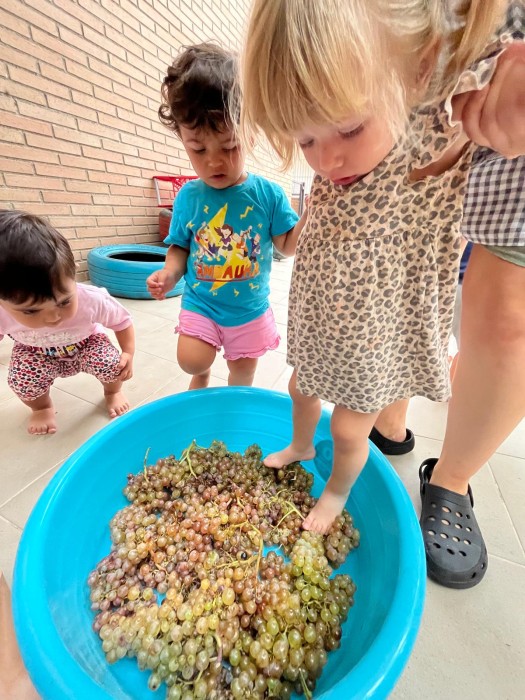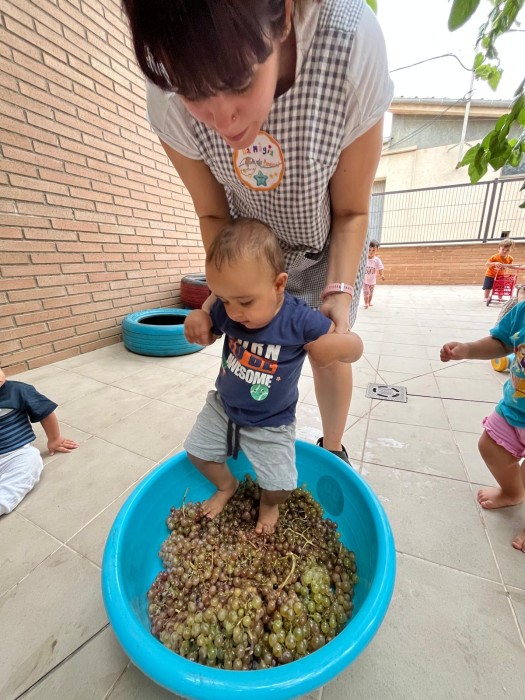 Seguidament durant els dies, han manipulat i experimentat amb raïm de color blanc i negre, que han pogut tastar, olorar, xafar, desgranar, transvasar... Descobrir la seva textura amb els peus ha sigut una aventura!