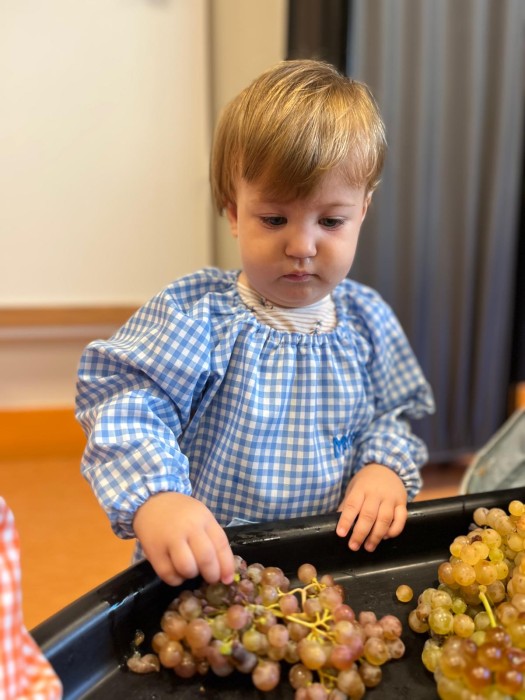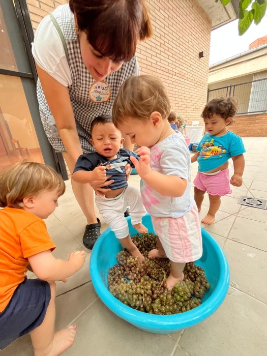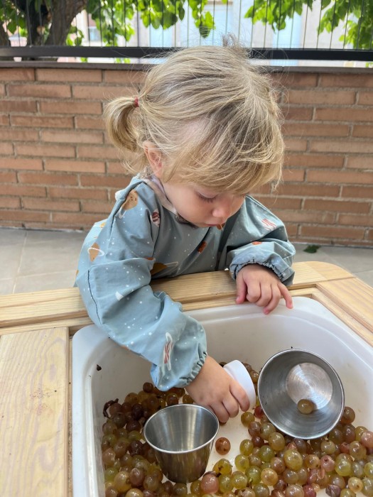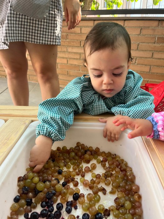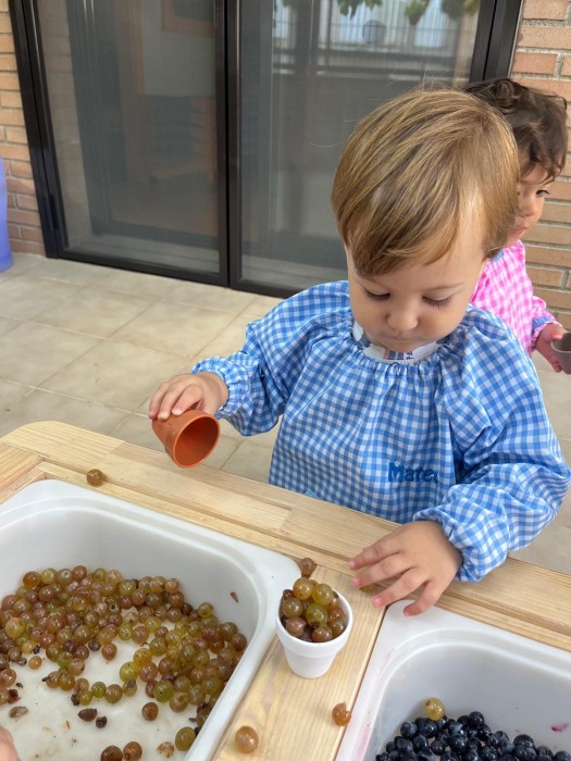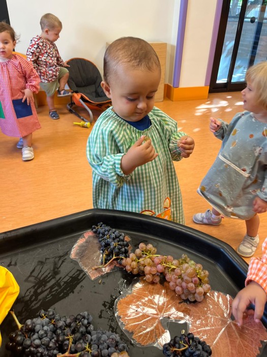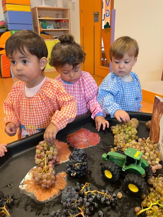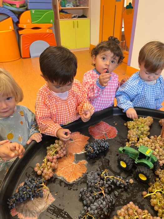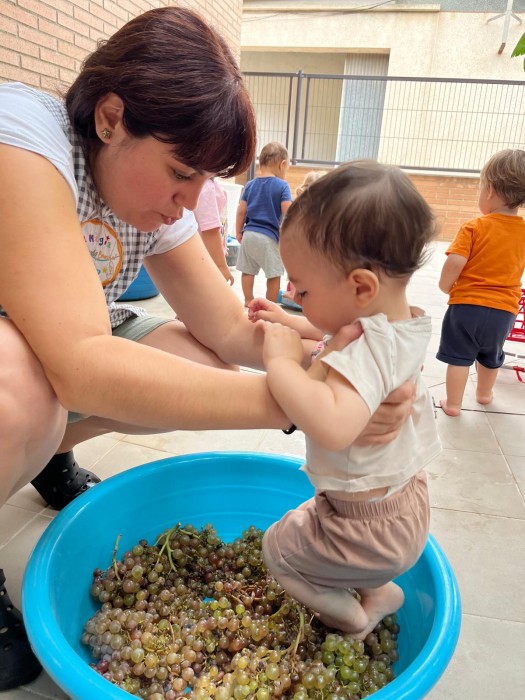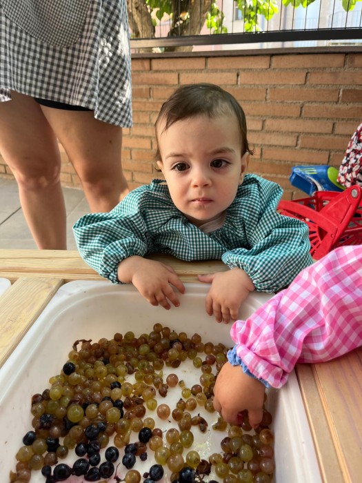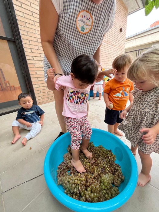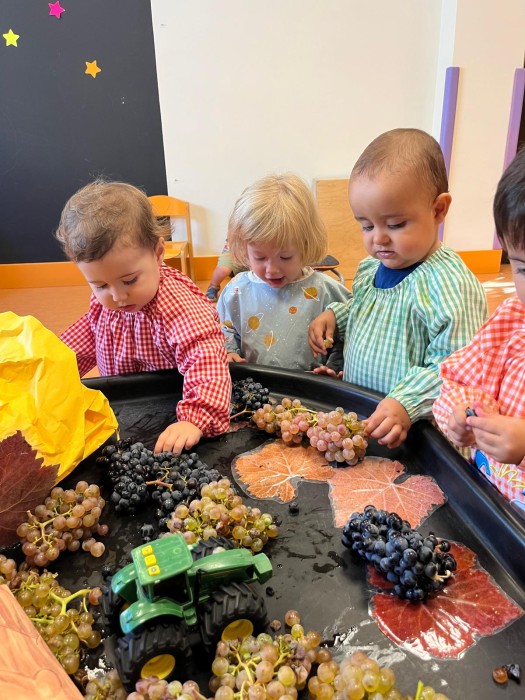 Seguidament durant els dies, han manipulat i experimentat amb raïm de color blanc i negre, que han pogut tastar, olorar, xafar, desgranar, transvasar... Descobrir la seva textura amb els peus ha sigut una aventura!