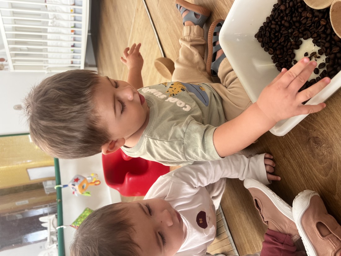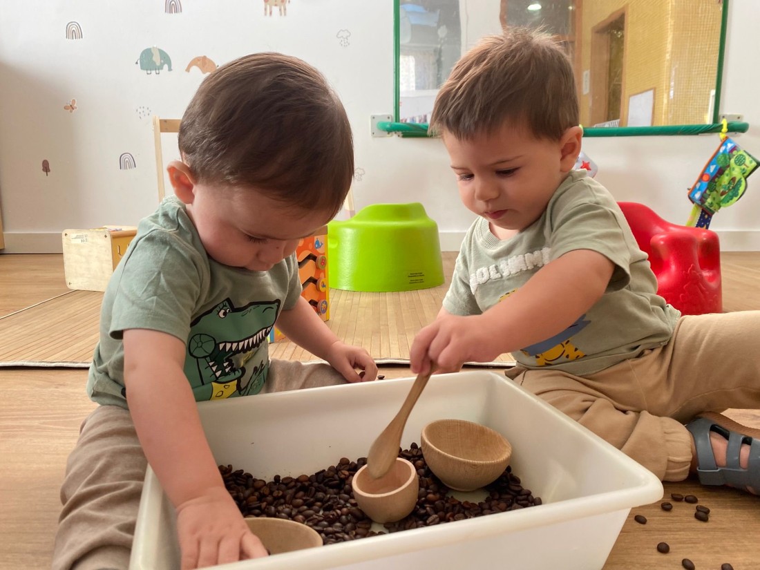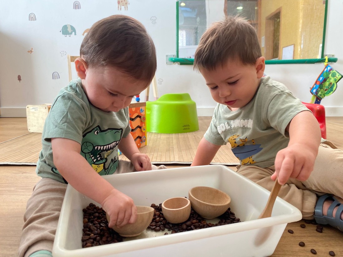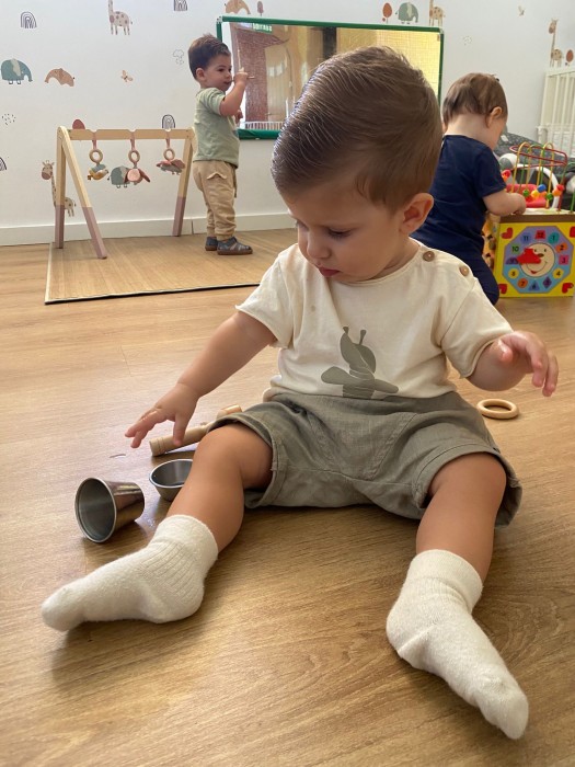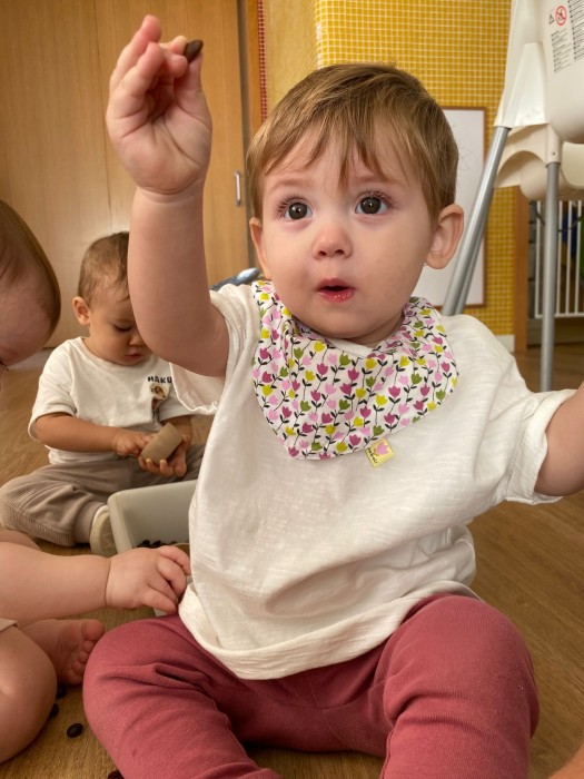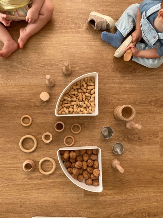Els petits mosquits s'han trobat un espai de joc amb materials de fusta per tal de poder-los explorar, transvassar i descobrir-ne les seves possibilitats
